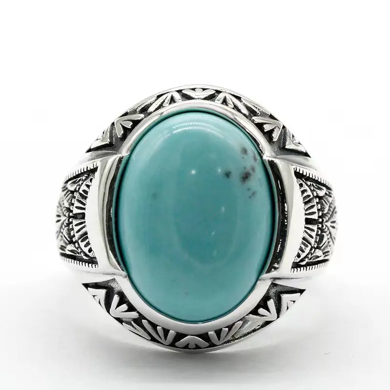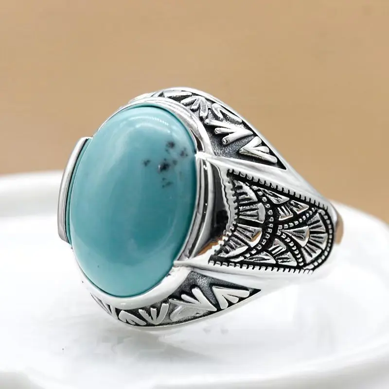 2021Vintage 925 Sterling Silver Oval Turquoise Rings for Men Women Turkish Jewelry Rings with Blue Natural Stone Punk Fashion